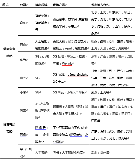 來(lái)源:根據(jù)公開(kāi)資料整理 綜合產(chǎn)品優(yōu)勢(shì)、地方合作、業(yè)務(wù)布局、投資合作等諸多因素來(lái)看,頭部科技互聯(lián)網(wǎng)公司新基建市場(chǎng)競(jìng)爭(zhēng)力可分為三個(gè)梯隊(duì):第一梯隊(duì)包括京東、阿里、騰訊、百度和華為;第二梯隊(duì)包括字節(jié)跳動(dòng)、中興和小米;第三梯隊(duì)包括蘇寧、網(wǎng)易和拼多多。具體來(lái)看: 第一梯隊(duì)特點(diǎn):綜合實(shí)力強(qiáng),布局范圍廣,政府合作能力強(qiáng)。第一梯隊(duì)公司有明顯的“技術(shù)+資本+戰(zhàn)略”優(yōu)勢(shì),布局范圍較廣,涉及數(shù)字政府、智能城市、智能交通、產(chǎn)業(yè)園建設(shè)、5G、人工智能、區(qū)塊鏈、大數(shù)據(jù)等諸多領(lǐng)域。同時(shí),這些公司和地方政府合作密切,一方面賦能地方公共服務(wù),一方面從頂層戰(zhàn)略層面切入地方產(chǎn)業(yè)。比如,阿里布局包括數(shù)字政府、智能城市、科技園項(xiàng)目、數(shù)據(jù)/云計(jì)算、人工智能、芯片等10多個(gè)領(lǐng)域,且每個(gè)領(lǐng)域均有成功案例;阿里的政府合作能力較強(qiáng),目前已與全國(guó)30個(gè)省市區(qū)達(dá)成合作,數(shù)字政務(wù)服務(wù)覆蓋全國(guó)442個(gè)城市。如阿里已和杭州“深度綁定”,形成了阿里政企合作的樣板。2019年,阿里整合阿里云、支付寶、釘釘、高德等技術(shù)、產(chǎn)品、服務(wù)、資源,全面升級(jí)服務(wù)數(shù)字政府戰(zhàn)略,即“數(shù)字政府2.0”。阿里云是阿里推進(jìn)數(shù)字政府、企業(yè)服務(wù)、技術(shù)賦能的核心。國(guó)際研究機(jī)構(gòu)Gartner在4月發(fā)布的云計(jì)算市場(chǎng)追蹤數(shù)據(jù)顯示,阿里云亞太市場(chǎng)排名第一,全球市場(chǎng)排名第三。阿里云還宣布未來(lái)3年再投2000億,用于云操作系統(tǒng)、服務(wù)器、芯片、網(wǎng)絡(luò)等重大核心技術(shù)研發(fā)攻堅(jiān)和面向未來(lái)的數(shù)據(jù)中心建設(shè),2020年阿里云再招5000人,重點(diǎn)吸引云服務(wù)器、網(wǎng)絡(luò)、芯片、數(shù)據(jù)庫(kù)、人工智能等核心技術(shù)領(lǐng)域的攻堅(jiān)人才。 騰訊則在新基建市場(chǎng)進(jìn)行了整體謀劃,技術(shù)和產(chǎn)業(yè)園布局較為領(lǐng)先。今年5月,騰訊宣布,未來(lái)五年將投入5000億元布局新基建,云計(jì)算、人工智能、區(qū)塊鏈、服務(wù)器、大型數(shù)據(jù)中心、超算中心、物聯(lián)網(wǎng)操作系統(tǒng)、5G網(wǎng)絡(luò)、音視頻通訊、網(wǎng)絡(luò)安全、量子計(jì)算等都將是騰訊重點(diǎn)投入領(lǐng)域。在數(shù)據(jù)中心方面,騰訊將陸續(xù)在全國(guó)新建多個(gè)百萬(wàn)級(jí)服務(wù)器規(guī)模的大型數(shù)據(jù)中心。同時(shí),騰訊還將結(jié)合產(chǎn)業(yè)技術(shù)創(chuàng)新需要,重點(diǎn)投入云啟產(chǎn)業(yè)基地、工業(yè)互聯(lián)網(wǎng)基地、創(chuàng)新中心、產(chǎn)業(yè)園區(qū)等方面的建設(shè)。目前來(lái)看,騰訊在數(shù)字政府、產(chǎn)業(yè)園、企業(yè)數(shù)字化、智慧醫(yī)療、云計(jì)算、5G、人工智能等領(lǐng)域有一定競(jìng)爭(zhēng)力。未來(lái),技術(shù)賦能、數(shù)據(jù)資產(chǎn)、產(chǎn)業(yè)園等將成為騰訊新基建布局發(fā)力的關(guān)鍵因素。 第二梯隊(duì)特點(diǎn):立足比較優(yōu)勢(shì),布局細(xì)分市場(chǎng)。第二梯隊(duì)公司在新基建市場(chǎng)布局方面更加聚焦垂直,重點(diǎn)布局自身優(yōu)勢(shì)領(lǐng)域,在垂直細(xì)分市場(chǎng)有一定競(jìng)爭(zhēng)力。比如字節(jié)跳動(dòng)在ToB領(lǐng)域、人工智能領(lǐng)域占據(jù)優(yōu)勢(shì)。在企業(yè)服務(wù)層面,繼飛書(shū)后,近期字節(jié)跳動(dòng)還推出了企業(yè)服務(wù)平臺(tái)“火山引擎”,該平臺(tái)包括智能推薦、機(jī)器翻譯等產(chǎn)品,以及短視頻、視頻互動(dòng)等解決方案,進(jìn)軍企業(yè)云服務(wù)。小米的優(yōu)勢(shì)是“5G+AloT”,故其從智能手機(jī)、智能家居等領(lǐng)域切入布局,以此構(gòu)建“萬(wàn)物互聯(lián)+智能場(chǎng)景”生態(tài)鏈。小米宣布,未來(lái)五年將在“5G+AIoT”領(lǐng)域投資500億元。 第三梯隊(duì)特點(diǎn):技術(shù)優(yōu)勢(shì)不突出,聚焦產(chǎn)業(yè)園區(qū)戰(zhàn)略。第三梯隊(duì)公司在新基建市場(chǎng)的布局范圍較窄,相比第一、二梯隊(duì)公司,“技術(shù)+資本”等綜合實(shí)力較弱,產(chǎn)品優(yōu)勢(shì)不太明顯,故布局比較依賴(lài)于通過(guò)地方合作推動(dòng)自身產(chǎn)業(yè)的擴(kuò)張。 科技公司新基建布局的模式是什么? 頭部科技互聯(lián)網(wǎng)公司新基建布局模式分析