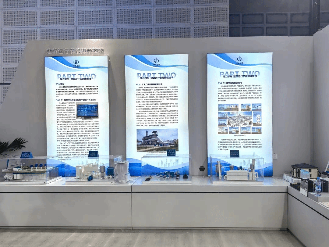 建筑運行節(jié)能降碳技術展區(qū),展現(xiàn)了地源熱泵系統(tǒng)、多臺純凝發(fā)電機組聯(lián)合供熱等清潔供熱技術。
