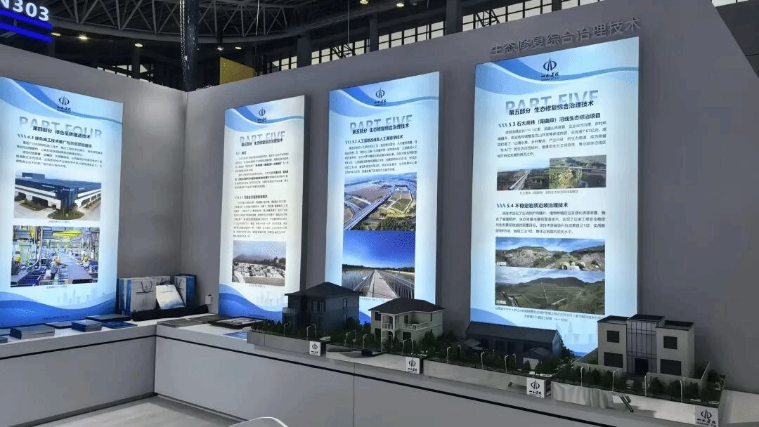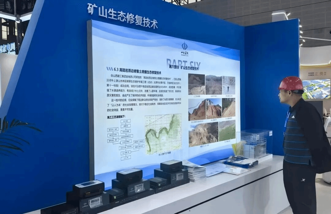 礦山生態(tài)修復技術展區(qū),展示了礦建工程設計、排矸場滅火、礦井充填開采等技術。