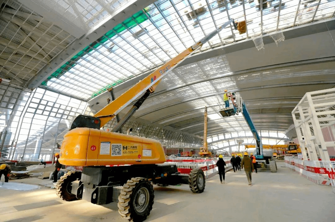 在實(shí)施雨棚燈安裝任務(wù)時(shí),集團(tuán)又遇到了新的困難和挑戰(zhàn)。雨棚屋面采用圓弧異型設(shè)計(jì),站臺(tái)禁止大型機(jī)械設(shè)備進(jìn)入,但普通設(shè)備根本無法完成50米高的作業(yè)任務(wù)。項(xiàng)目團(tuán)隊(duì)急中生智,想出妙招——緊急調(diào)來100臺(tái)舉臂車,這些“鋼鐵螳螂”揮舞長(zhǎng)臂,將作業(yè)人員舉升到空中進(jìn)行作業(yè)。最終,完成了12000盞燈的安裝。