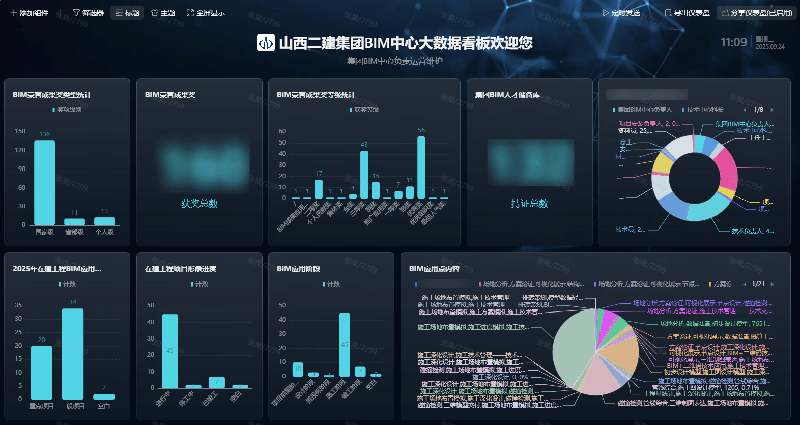 集團(tuán)層面強(qiáng)化頂層設(shè)計(jì),不僅編制出臺(tái)了《BIM技術(shù)應(yīng)用管理辦法》和《BIM應(yīng)用實(shí)施指南》等制度,更從大量實(shí)踐中提煉出125個(gè)關(guān)鍵的BIM價(jià)值點(diǎn),讓技術(shù)應(yīng)用有了清晰的價(jià)值導(dǎo)向;主動(dòng)參與3項(xiàng)山西省地方標(biāo)準(zhǔn)的制定,將企業(yè)的最佳實(shí)踐轉(zhuǎn)化為建筑行業(yè)的共同規(guī)范;搭建企業(yè)級(jí)BIM大數(shù)據(jù)看板,實(shí)現(xiàn)了對(duì)33家基層單位、所有在建項(xiàng)目的全過程動(dòng)態(tài)監(jiān)控,讓管理決策從“經(jīng)驗(yàn)驅(qū)動(dòng)”邁向“數(shù)據(jù)驅(qū)動(dòng)”。