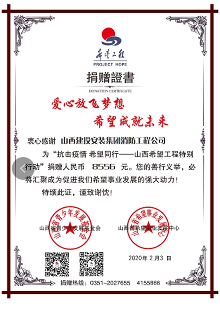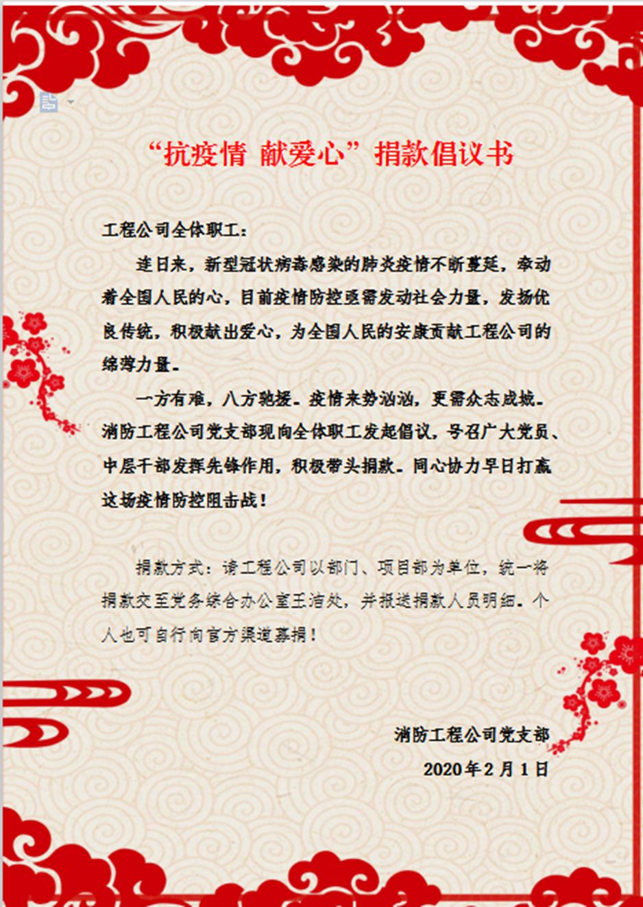 消防工程公司黨支部也于近日組織了愛心捐款活動。僅用一天時間,共募得捐款8556元,已通過山西希望工程定向捐助到武漢,專用于疫情防控。