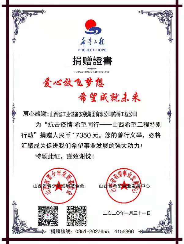 1月29日晚,路橋工程公司在微信群中號召全體職工積極參與支援武漢愛心捐款活動。截至30日中午,一共募得人民幣17350元,全部捐贈至“抗擊疫情 希望同行——山西希望工程特別行動”。這筆愛心款將作為山西省援鄂醫(yī)療隊的藥品資助,為抗擊疫情做出貢獻。