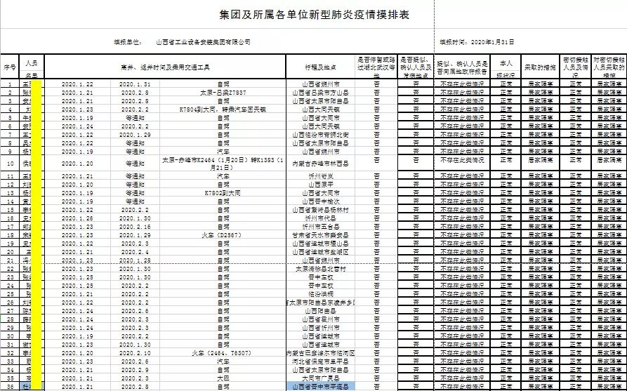 各單位、各部門逐級摸清職工和項目勞務人員的假期行程、活動地點,特別是自武漢來晉返晉途晉人員情況,每日向公司綜合辦公室上報。