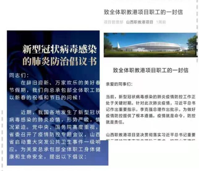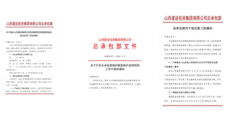 總承包部嚴格貫徹落實集團要求,第一時間下發(fā)《關(guān)于做好山西建投集團總承包部新型冠狀病毒感染的肺炎防控工作的通知》、《關(guān)于印發(fā)總承包部做好新型肺炎疫情防控工作方案的通知》、《總承包部關(guān)于延遲復(fù)工的通知》等文件,對做好該項重要工作作出了專門部署。