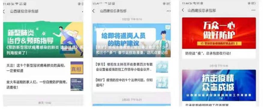 連日來,總承包部借助微信工作群、微信公眾平臺等新媒介,實時傳達上級防疫工作部署,加強引導(dǎo)和輿情監(jiān)控,大力宣傳防疫科普知識,全力營造萬眾一心、眾志成城的積極輿論氛圍。